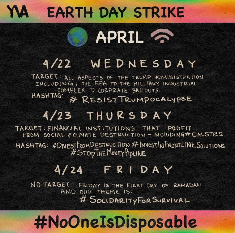 在更大的范围内,美国气候打击联盟和停止资金输送联盟共同组成了500多个组织,其中包括许多由年轻人领导的组织,如日出运动、国际土著青年理事会和未来星期五等,他们一起组织了另一个地球日现场活动为期三天的系列,地球日网络正在努力提供支持。这场在线活动包括一个直播的演讲和表演,从美国东部时间上午9点开始,一直持续到晚上。